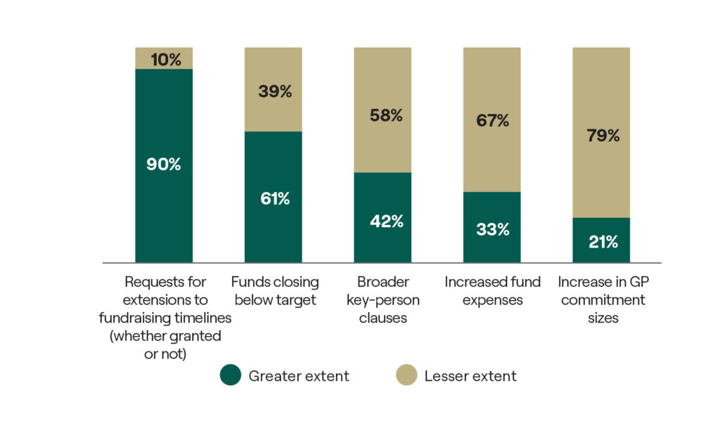 Given the tight liquidity environment, the vast majority of respondents have received fundraising extension requests from their GPs in the past 12 months. Nearly two-thirds have also observed funds closing below target over the same period. The views expressed were consistent across regions.