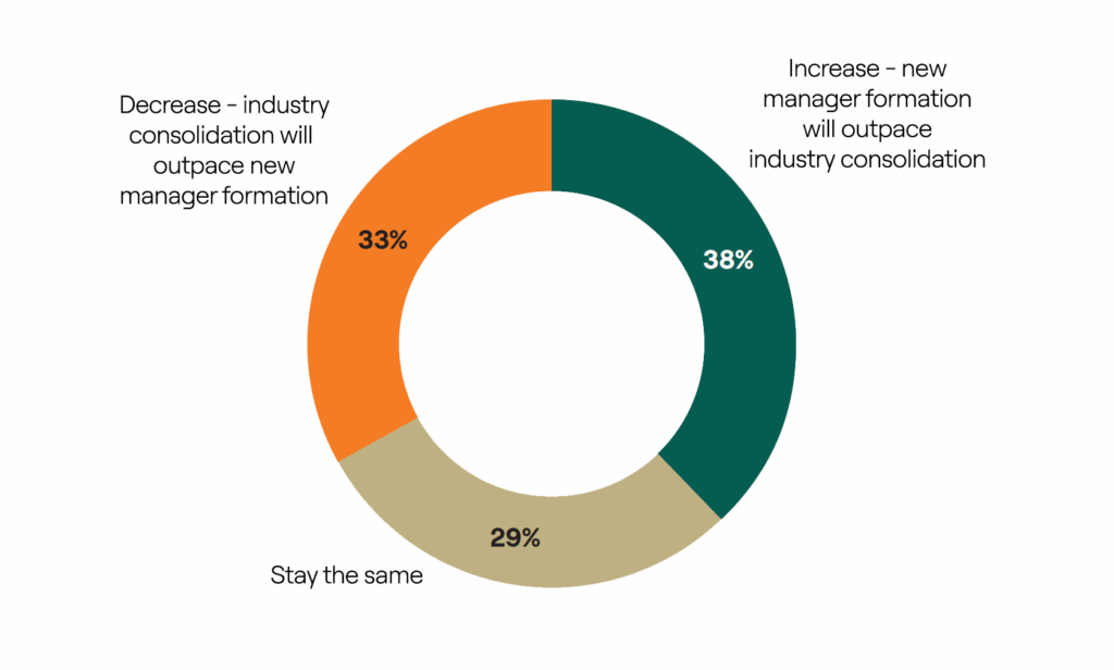 Now, despite the pace of consolidation within the industry, almost 40% of investors believe that new manager formation will outpace GP consolidation.
