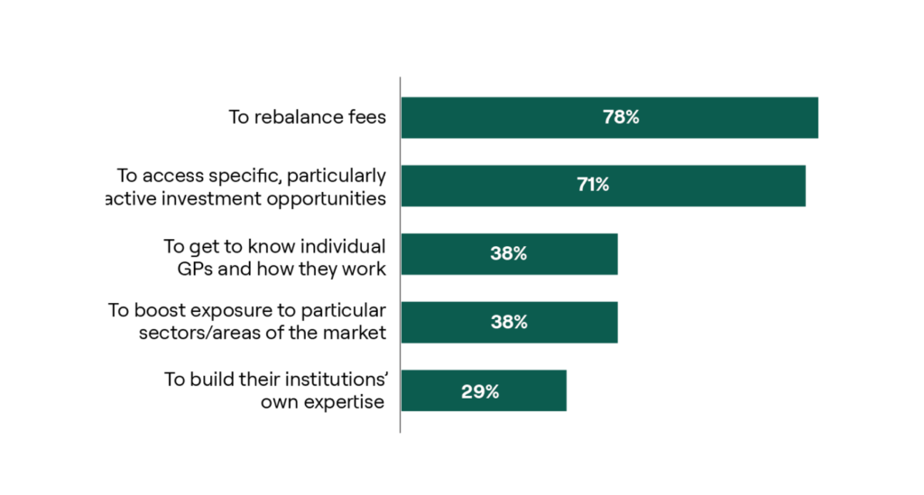 More than three-quarters of LPs say that rebalancing fees is a major reason for pursuing co-investments, followed by 71% who emphasise access to attractive investment opportunities. These findings highlight the role of co‑investments in delivering economic efficiencies and strategic value for investors.