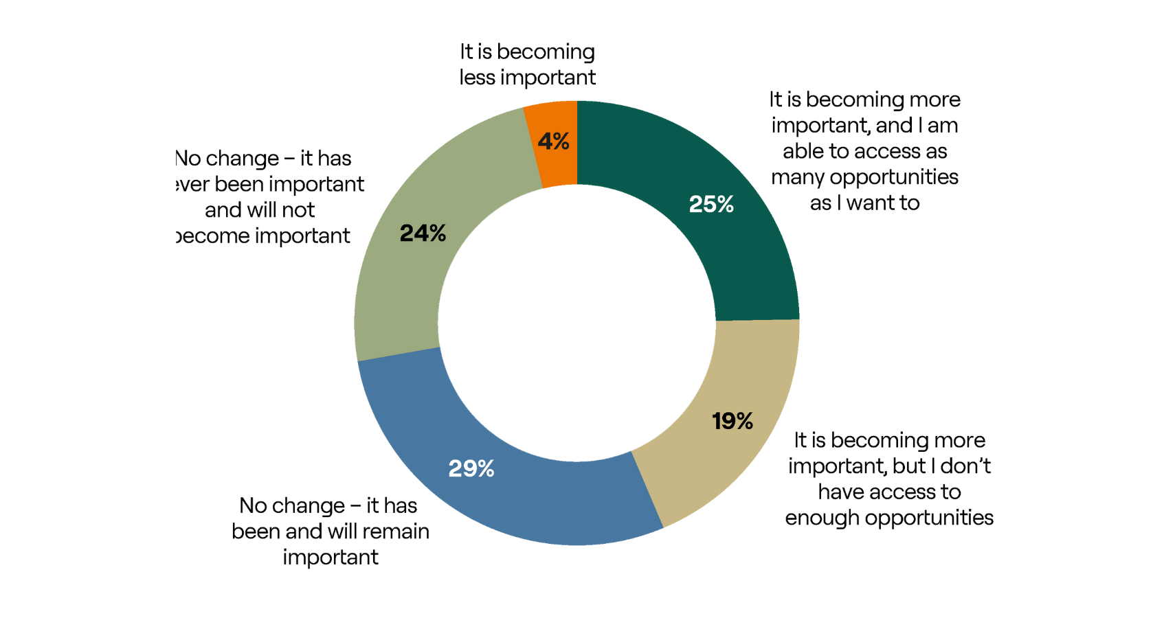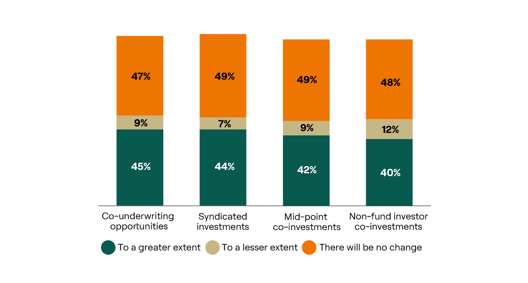 Nearly half (44%) of respondents indicate that co‑investments are becoming more important to their investment decision-making, with only 4% viewing them as less so, suggesting that access to these deals can influence which funds LPs back. However, not all LPs see as much deal flow as they would like: 19% say co-investments are increasing in importance for them, but they don’t have access to enough opportunities.