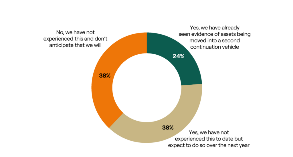 As the market develops further, we are starting to see continuation vehicles of existing continuation vehicles. LPs are also witnessing this trend, with 62% of respondents saying they have already seen, or expect to see, CVs “squared”