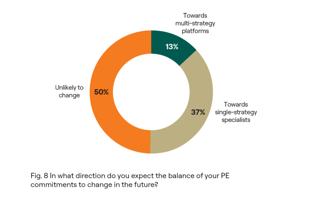 Among respondents, 37% foresee a shift in the allocation of their private equity commitments towards single‑strategy specialists in the coming years. This underscores the importance of specialisation and clarity of investment strategy.