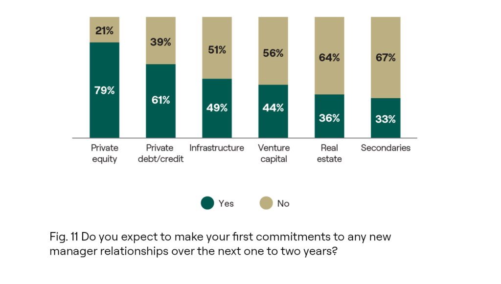 An overwhelming 86% of LPs plan on making a first commitment to a new manager relationship in any of the strategies in the next one to two years. Across the individual strategies, private equity garnered the most votes, with over three-quarters of respondents. Additionally, private credit and infrastructure emerged as stand-out strategies attracting LP interest, with 61% and 49% of respondents respectively indicating their intentions to initiate commitments with new managers across these sectors over the same period. This proactive stance highlights LPs’ efforts to diversify and explore opportunities across the spectrum of alternative investment strategies.