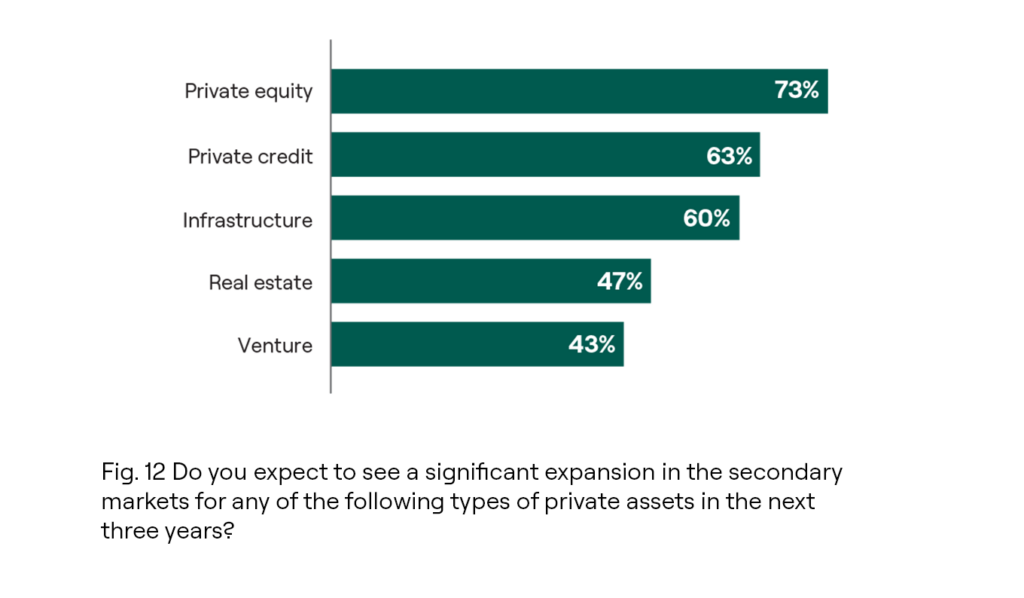 Private equity secondaries has emerged as the secondary strategy poised for the most substantial expansion over the next three years, with 73% of respondents expecting this to be the case. Additionally, private credit and infrastructure are anticipated to expand during this period with 63% and 60% of respondents respectively expressing confidence in growth.