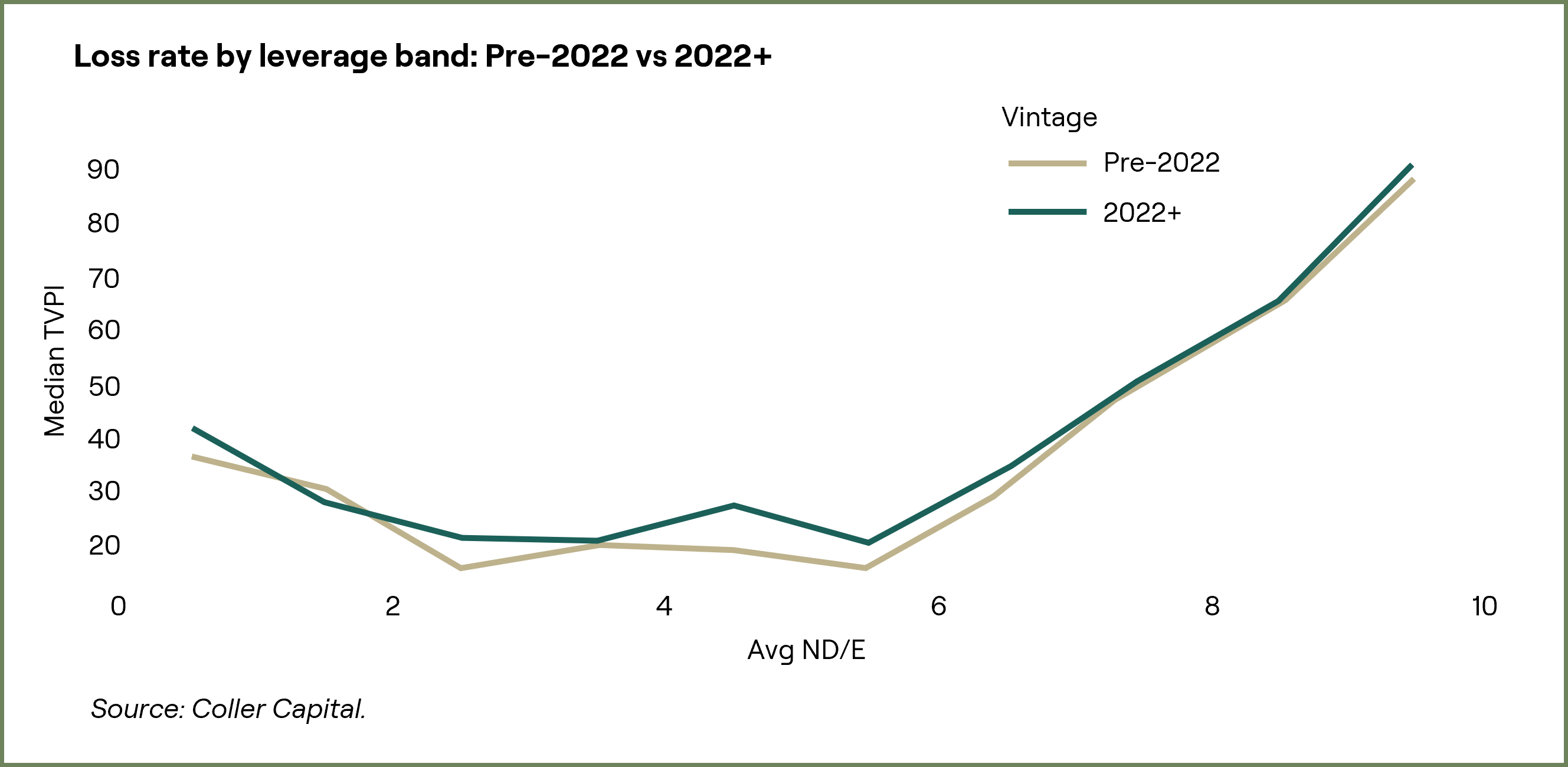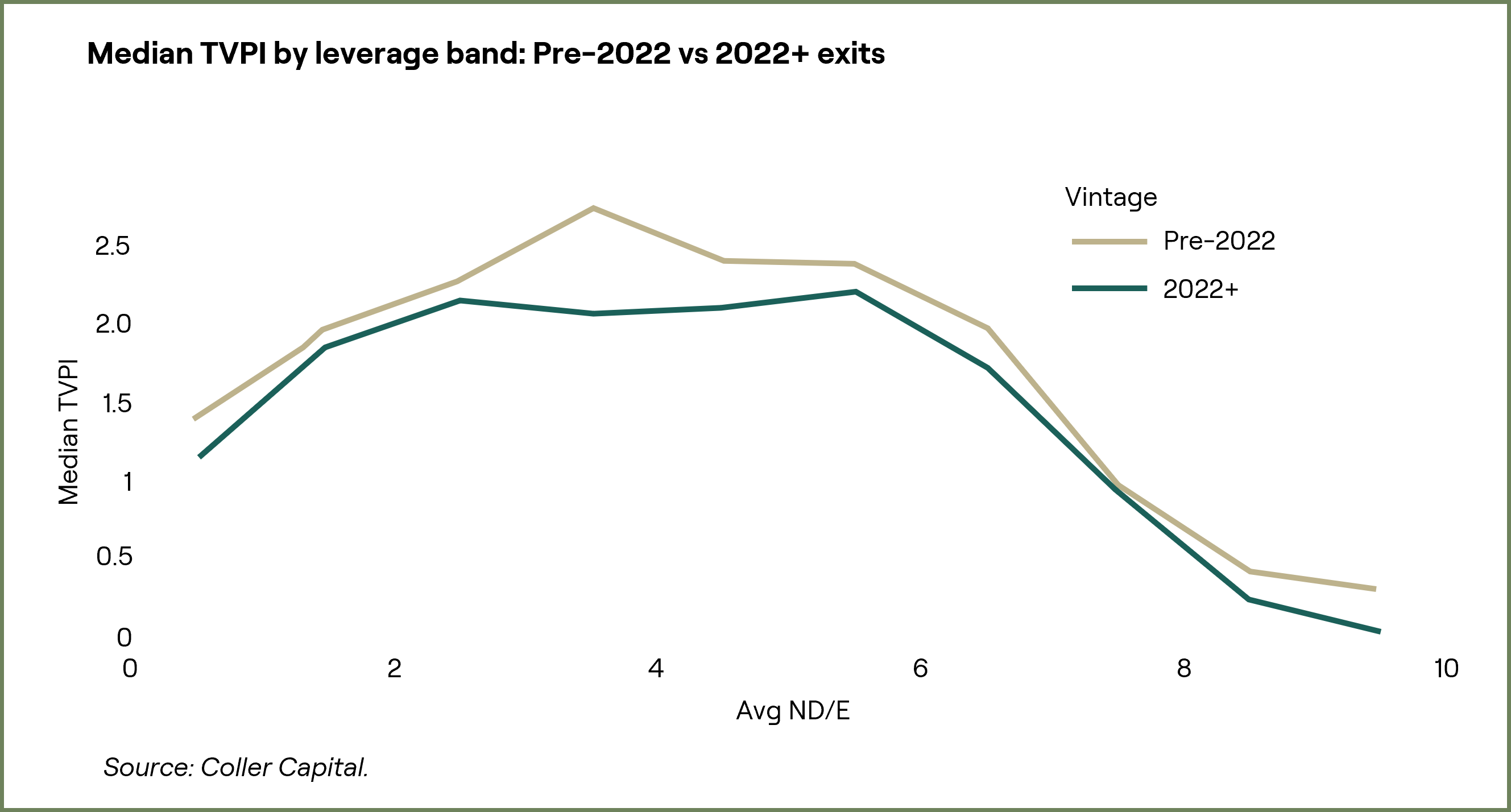 Returns compressed across all bands in exits post 2022, with higher leverage bands (4–6x) showing directionally more fragility. This suggests the Goldilocks zone may narrow under stress, reinforcing why dynamic monitoring matters more than static rules.