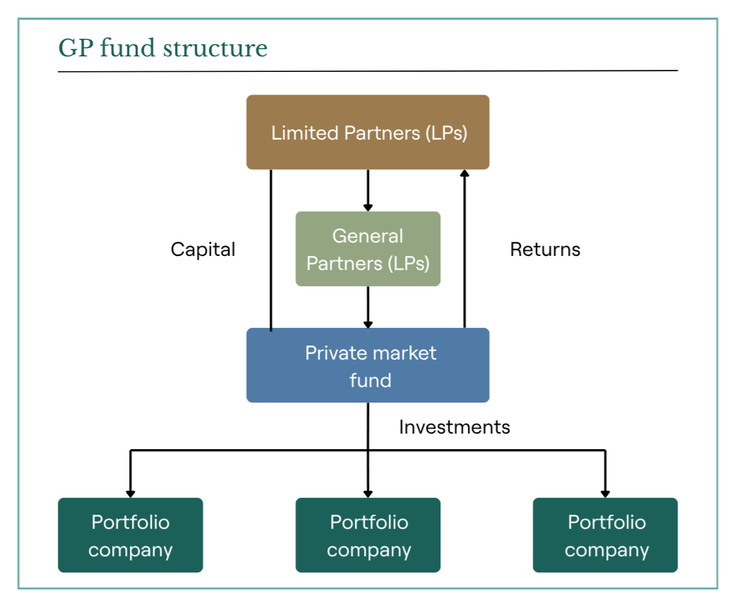 A General Partner (GP) is the private market fund’s partner that has the legal authority to make decisions for the fund. Under each fund structure, GPs are permitted to manage the private market fund and choose the investments to include in their portfolios.