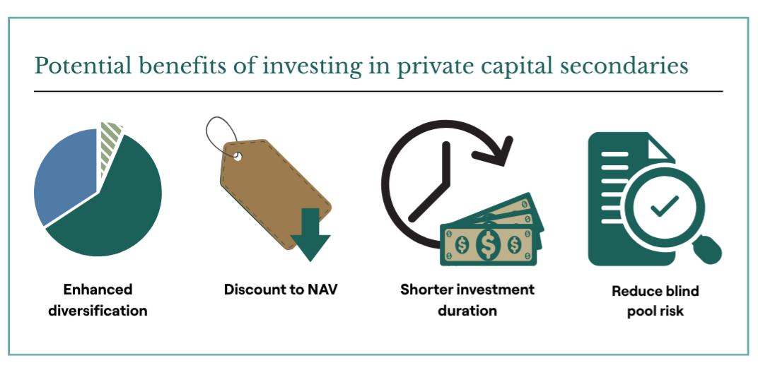 Secondary investing typically involves the acquisition of mature, substantially invested portfolios, often acquired at a discount to NAV, thus avoiding the ‘blind pool’ risk of the primary investment. Given the investments are more mature than those made by primary funds, distributions can be passed back to secondary fund investors faster. Also, secondary funds are typically much more diversified than primary funds given the multitude of underlying GPs, funds and exposure to portfolio companies.