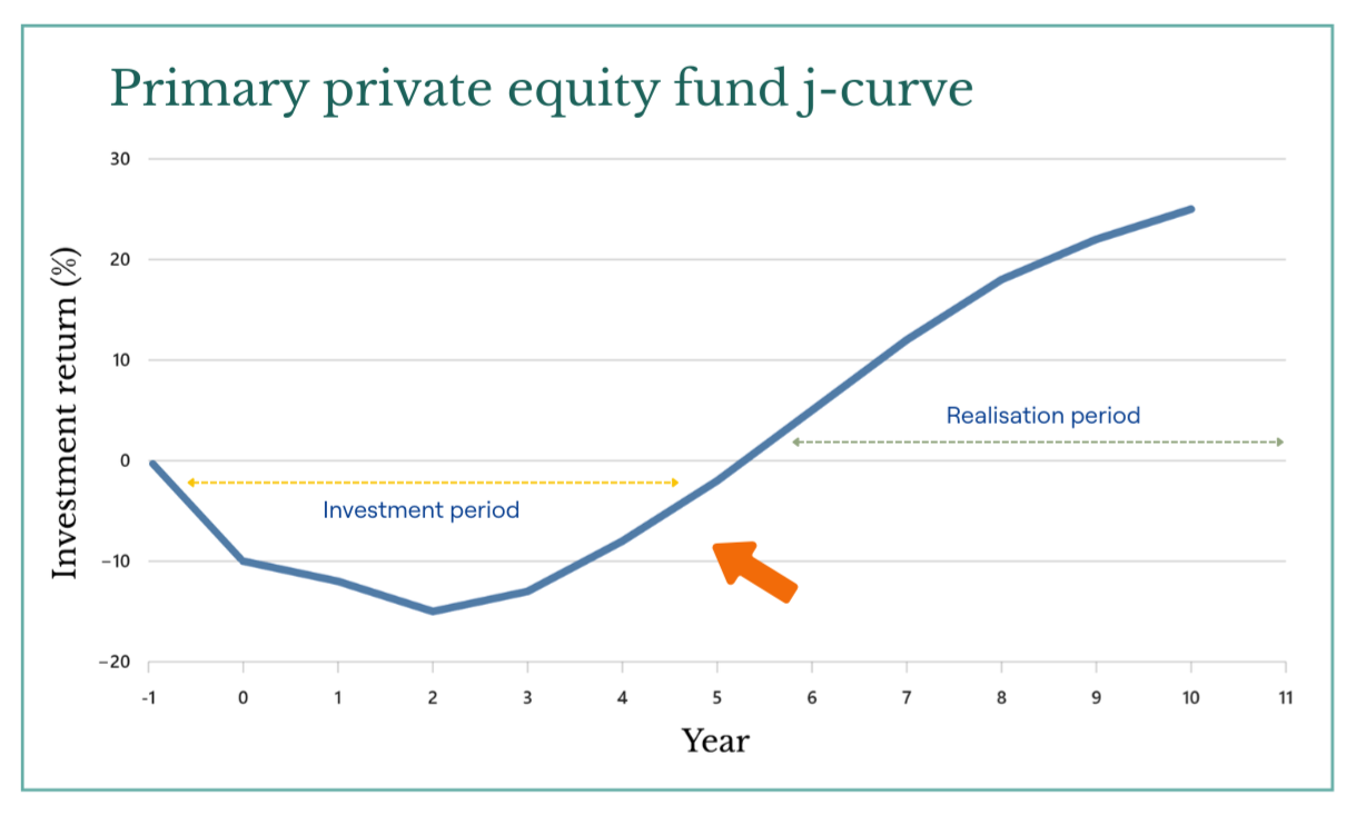 The ‘J-curve’ is a concept used to describe the typical cash flow pattern in private market funds, where the capital drawdowns and distributions follow the shape of the letter ‘J’. In the early years of a fund, you’ll often see negative performance, represented by the curved part of the J. This occurs because capital is being deployed to cover fees, operational expenses, and to make new investments. As the fund progresses and investments grow, returns often rise above the initial costs and the fund starts generating positive gains. This turning point is shown by the upward curve of the J.