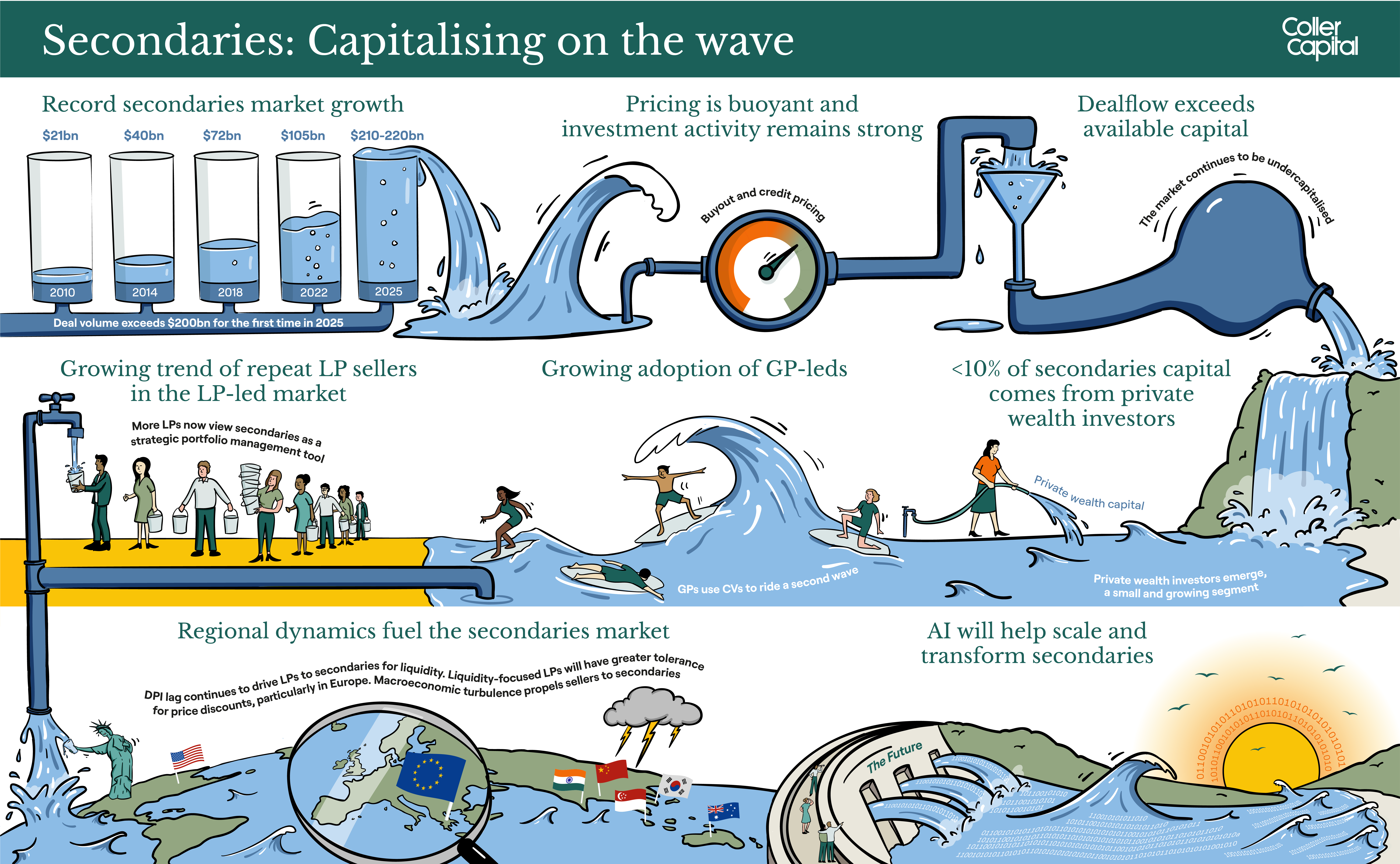 The secondaries market experienced a pronounced growth spurt in 2025 with transaction volumes expected to surge to an estimated $220-230bn, up over 30% from the prior year1.